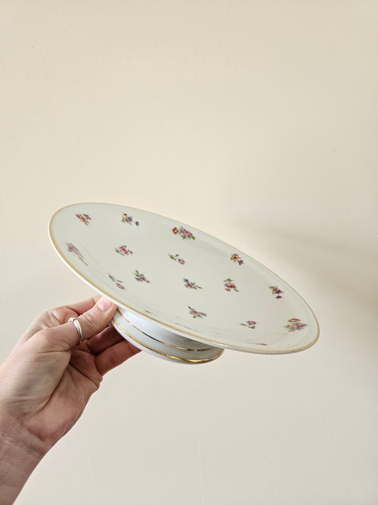 Assiette sur pied vintage en porcelaine, petites fleurs