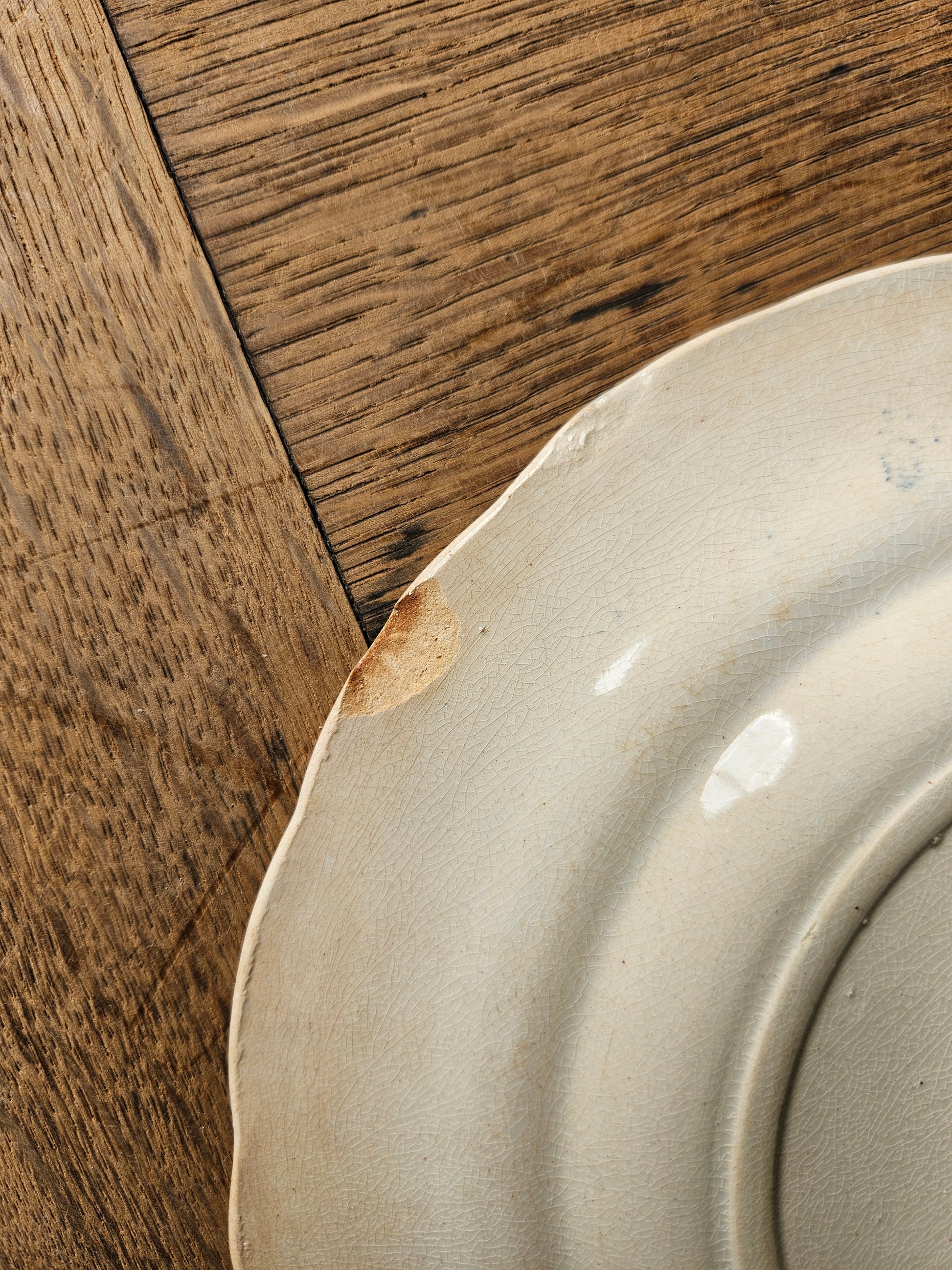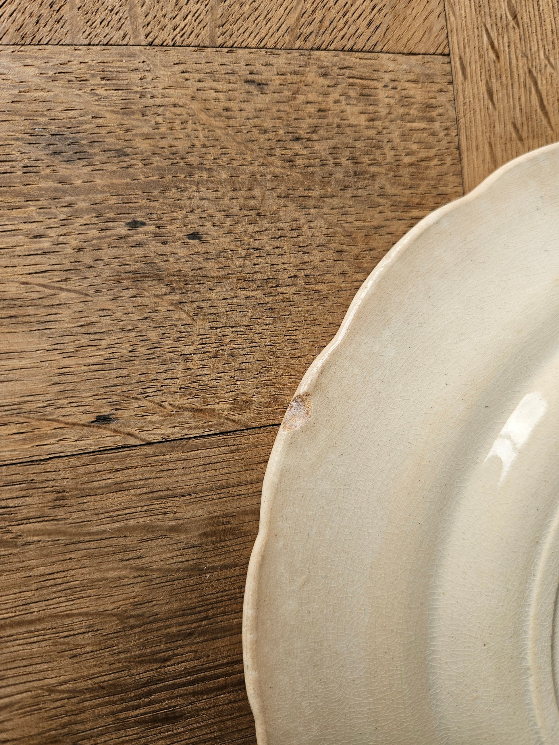 Charmante patine. Couleur brunie (plus prononcée sur le pourtour). Des traces du temps. 2 ébréchures à noter sous 2 assiettes.