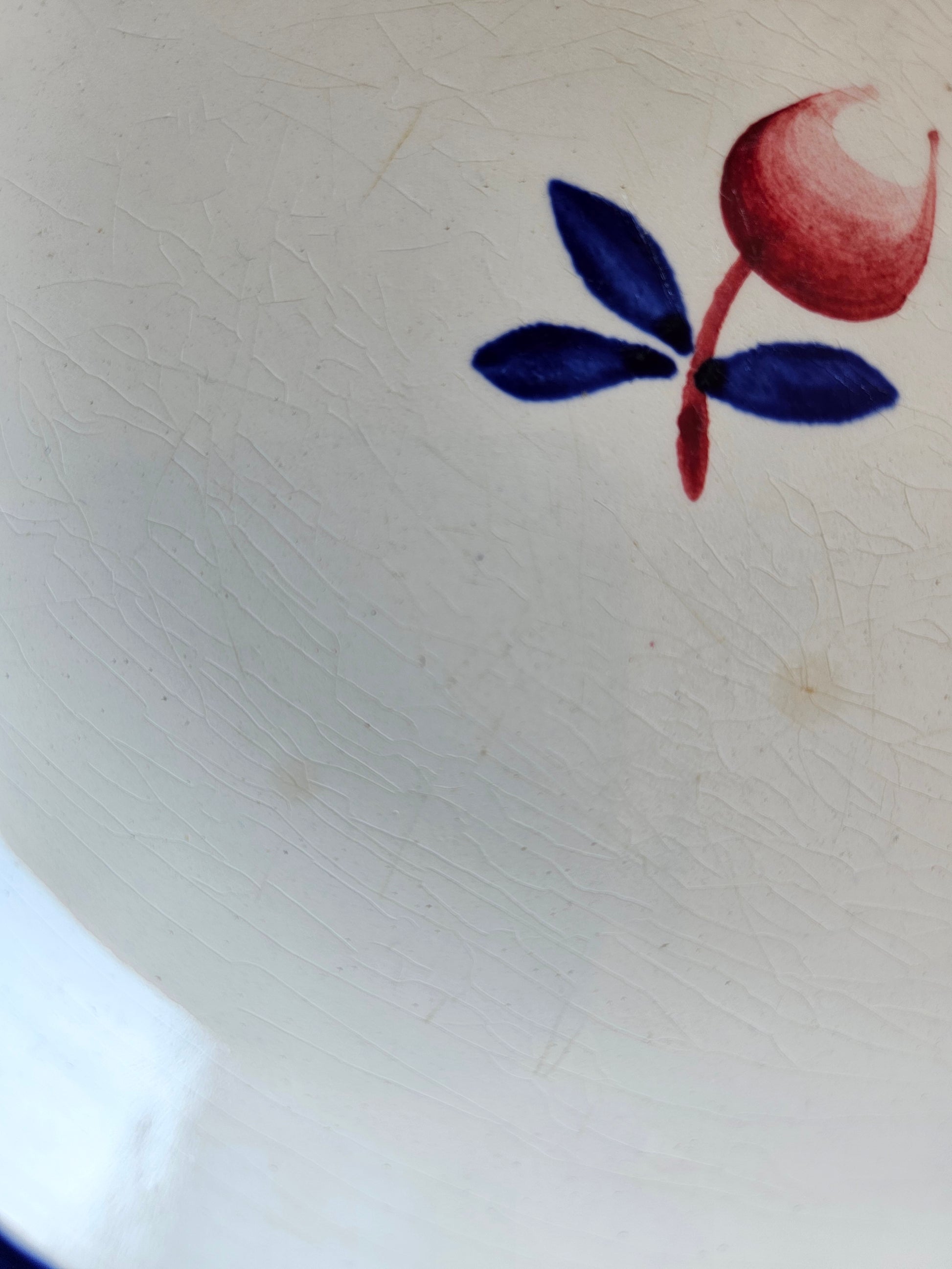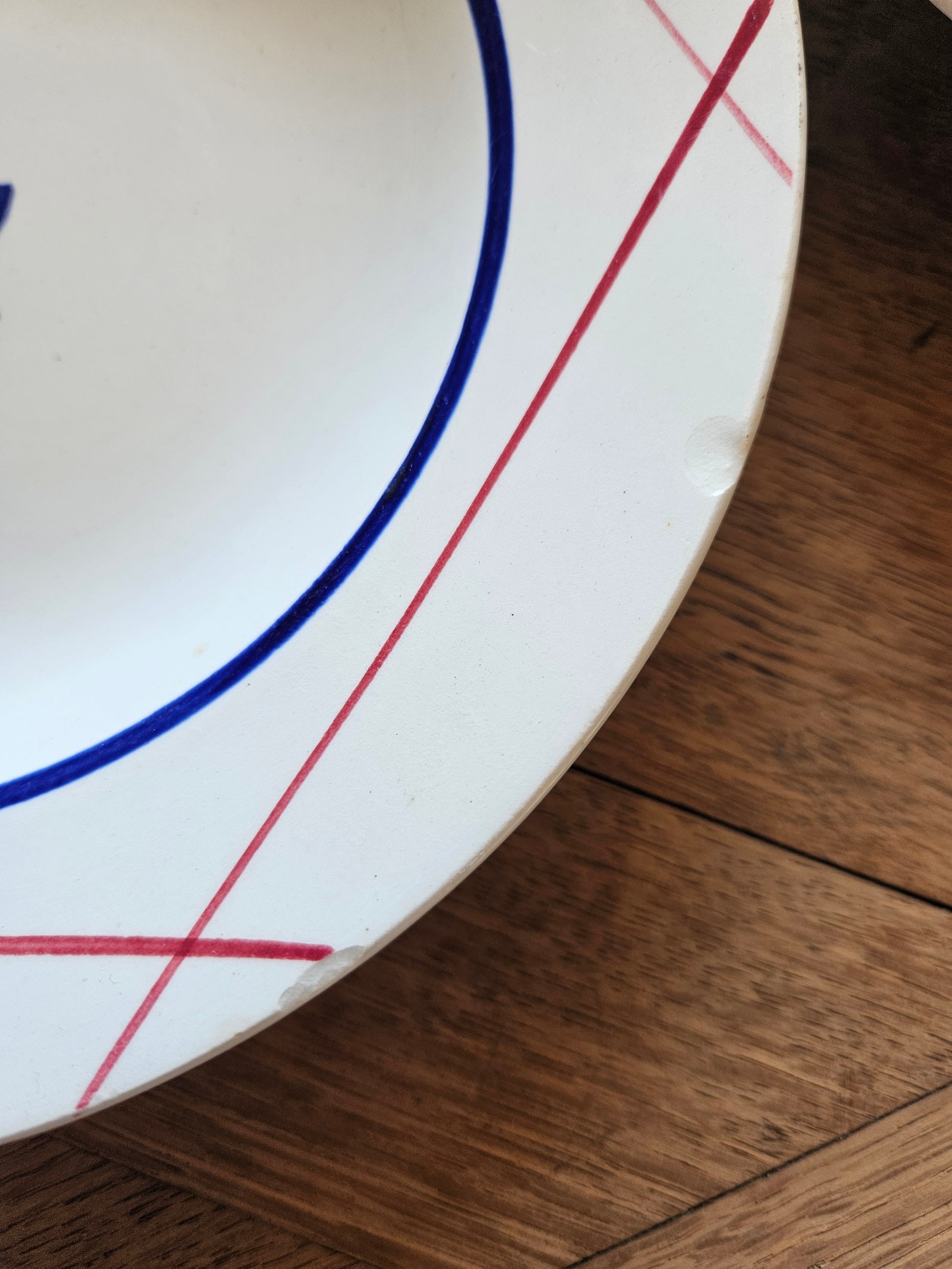 Décor peint à la main. Motifs bleus et rouges, faisant un peu penser à la vaisselle basque.