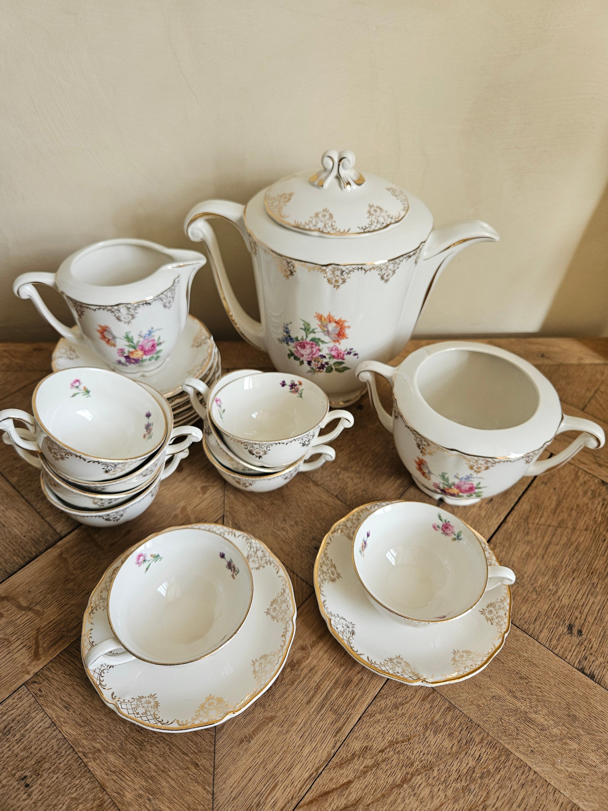 Composé de 9 tasses et sous-tasses, 1 verseuse, 1 pot à lait, 1 sucrier (sans couvercle).