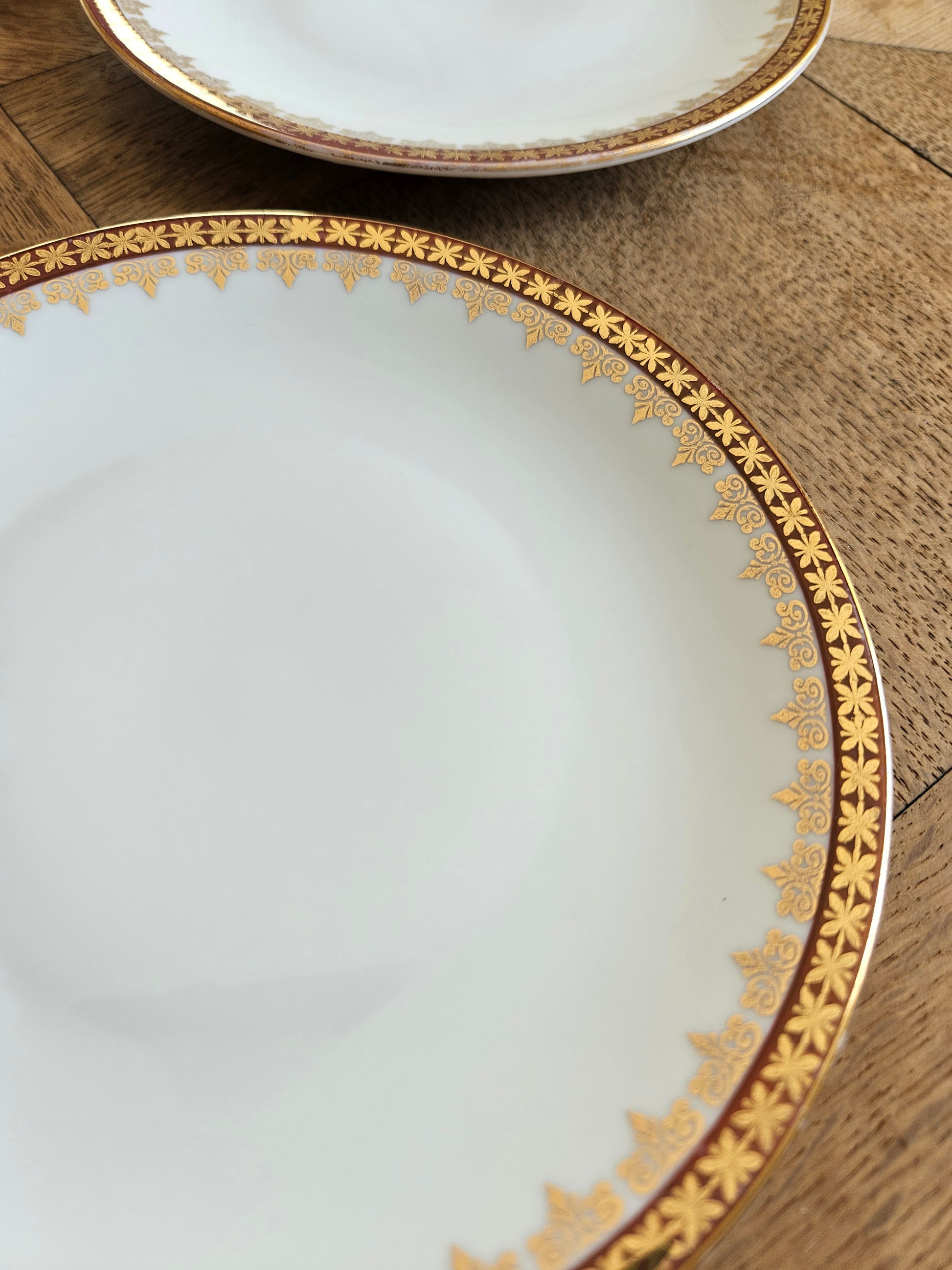 Très bon état général. Rares traces d’usage sur certaines assiettes. Quelques manques de dorure, notamment sur les poignées du plat.