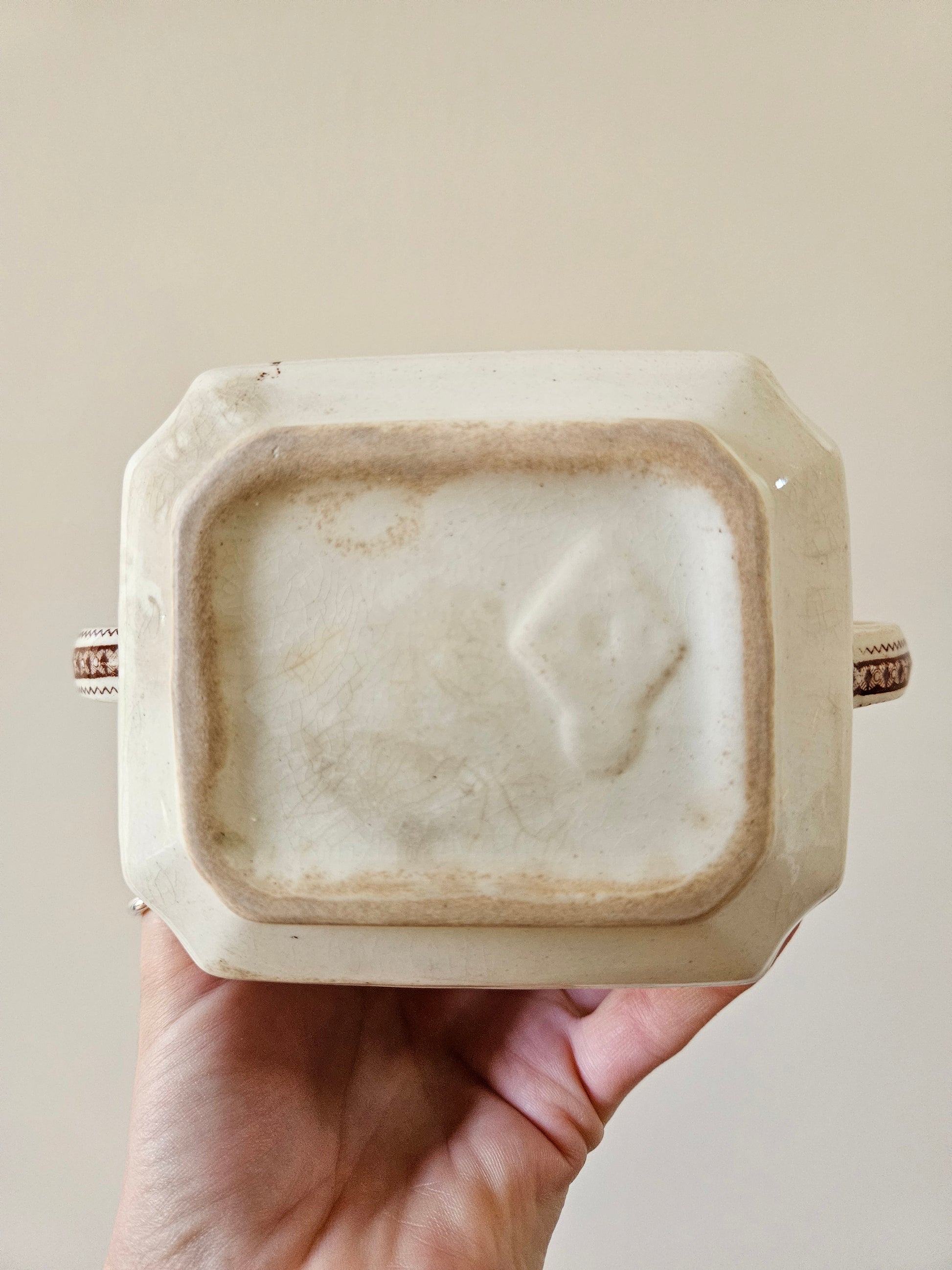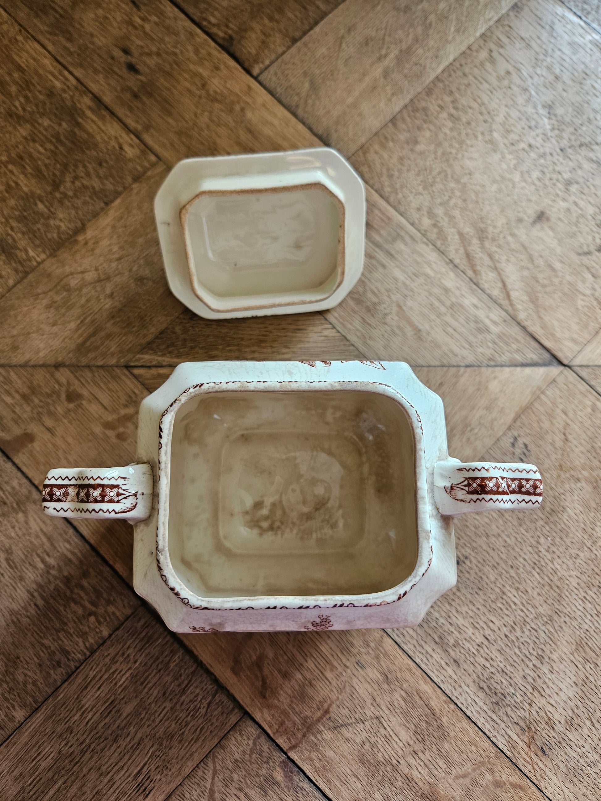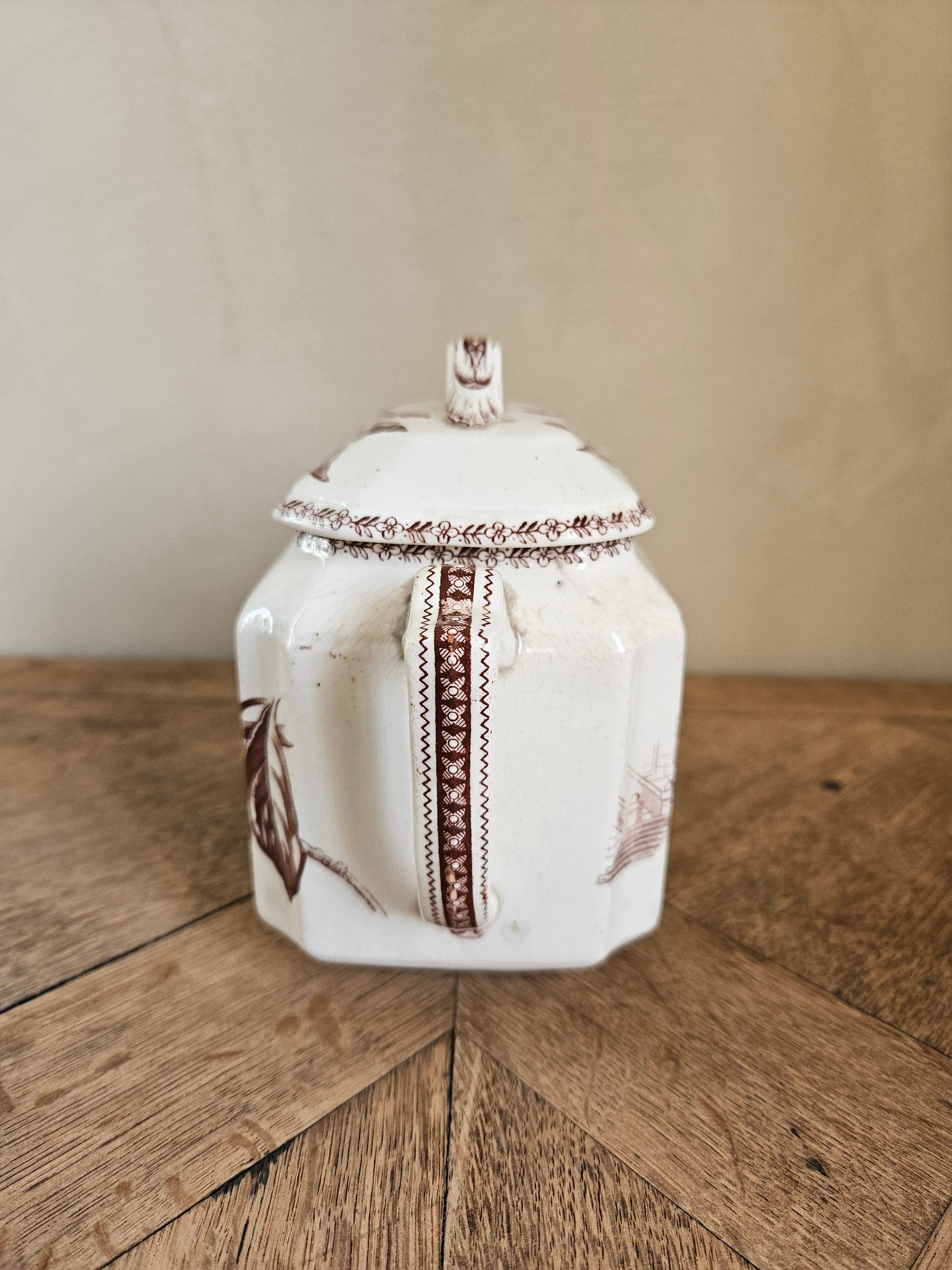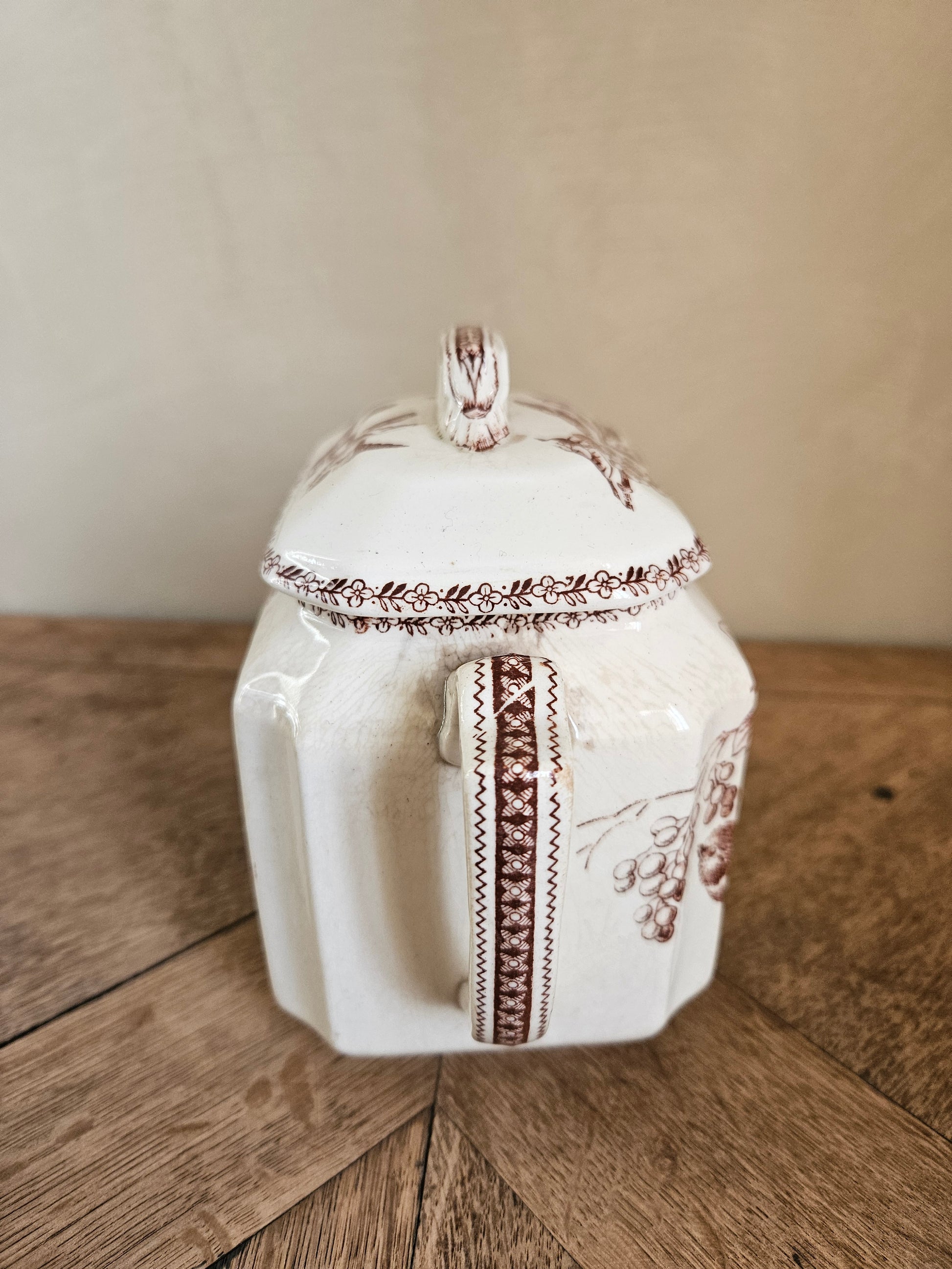 Sucrier ancien oiseaux et fleurs, sépia