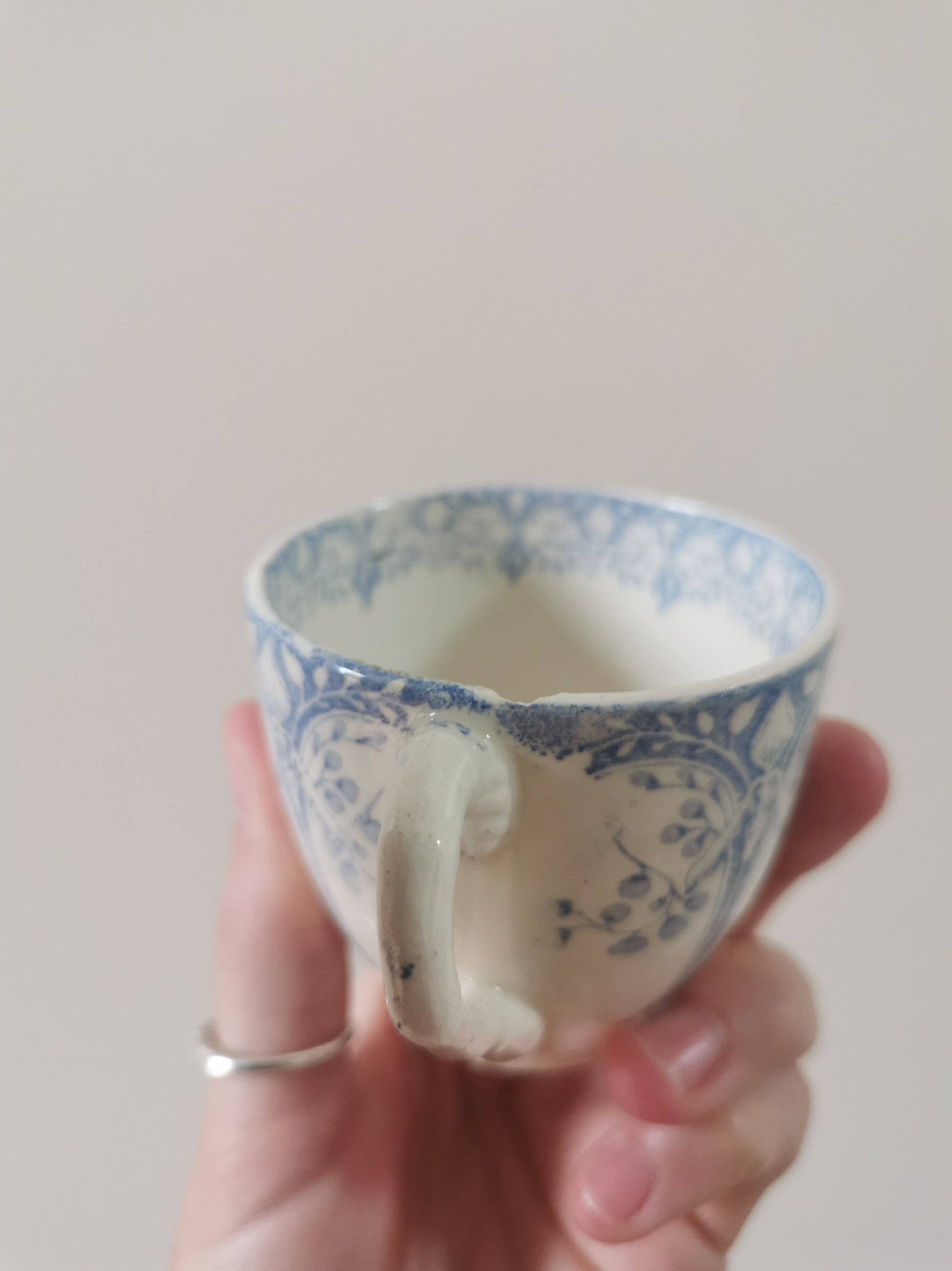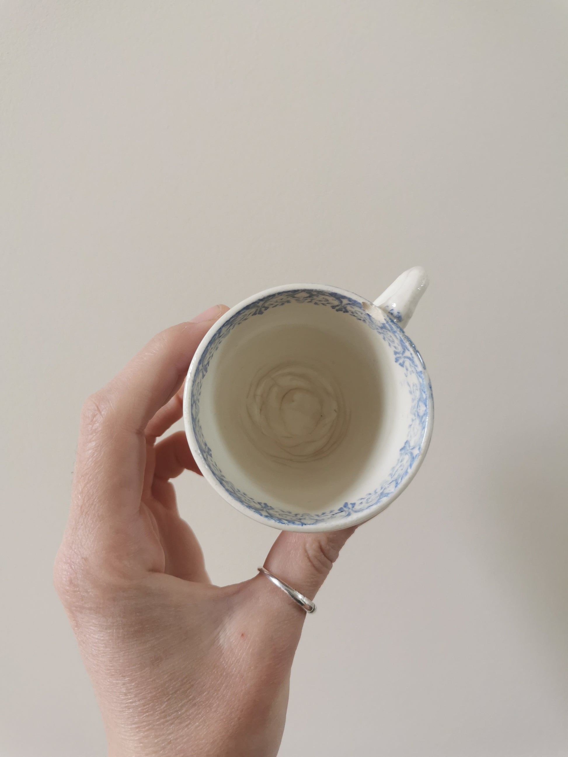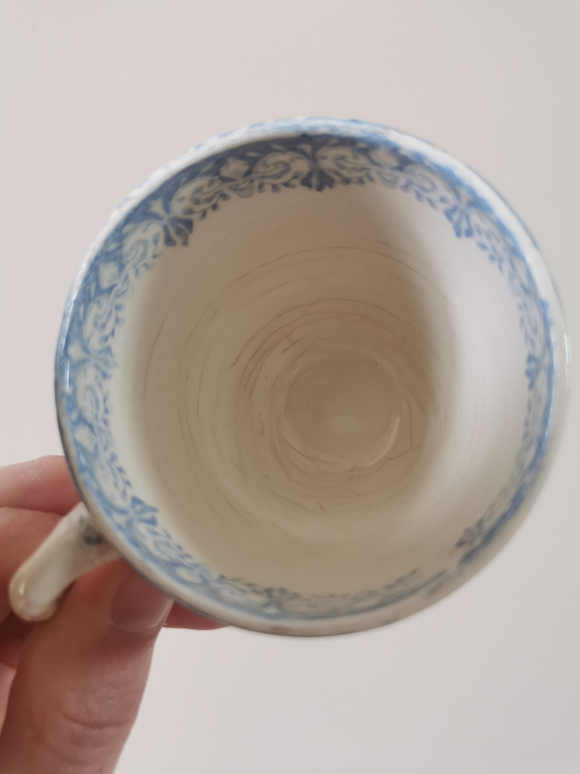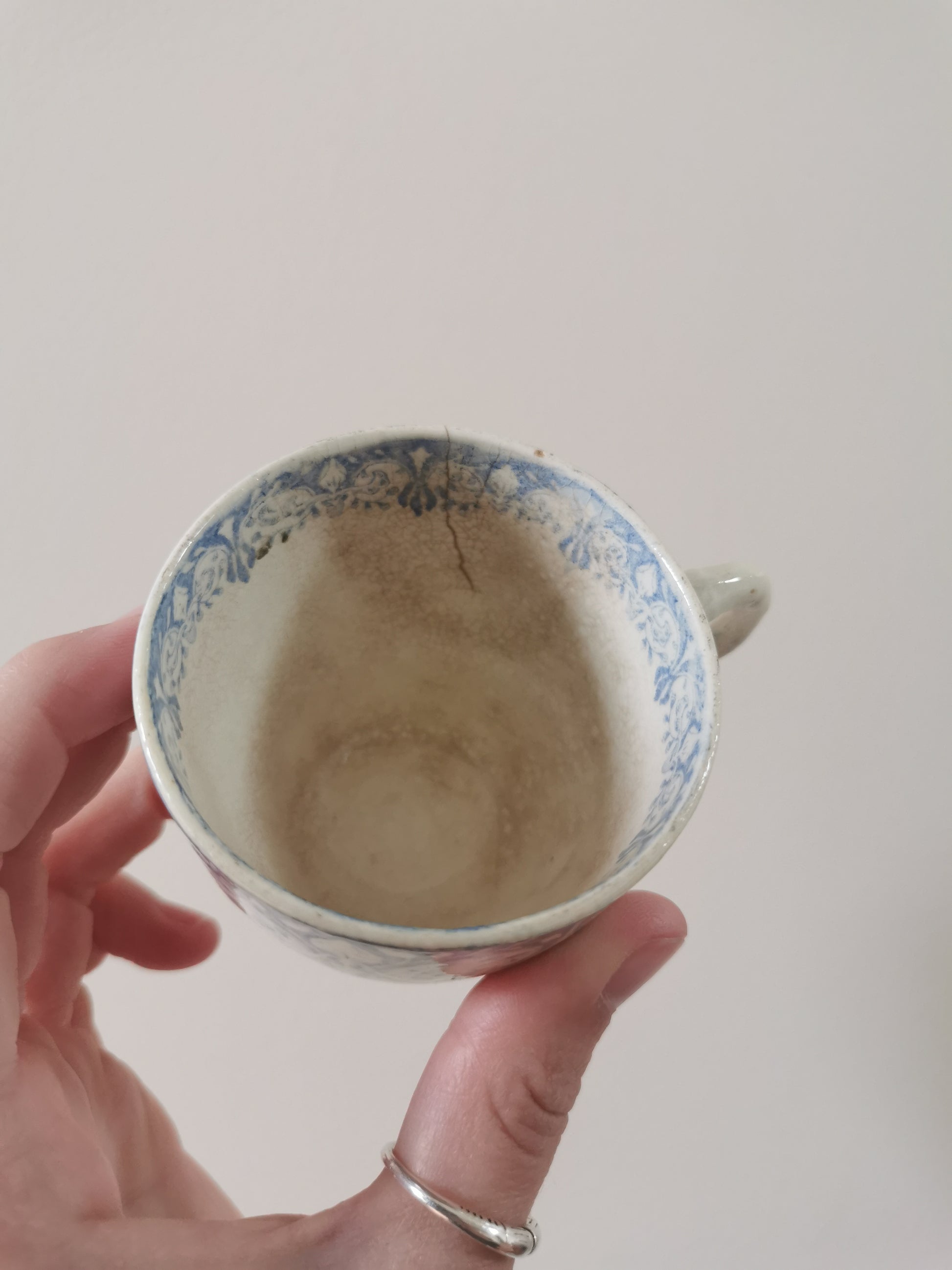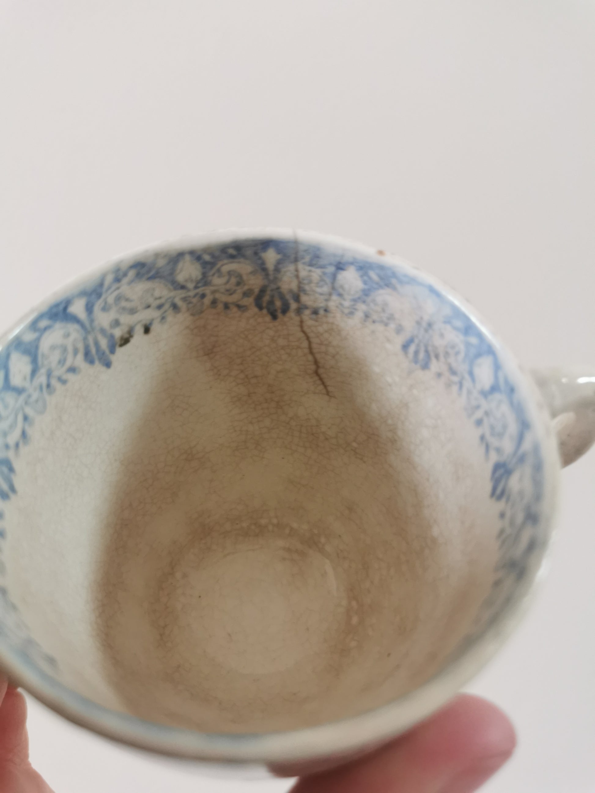 Une tasse présente un cheveu, surtout visible à l'intérieur.