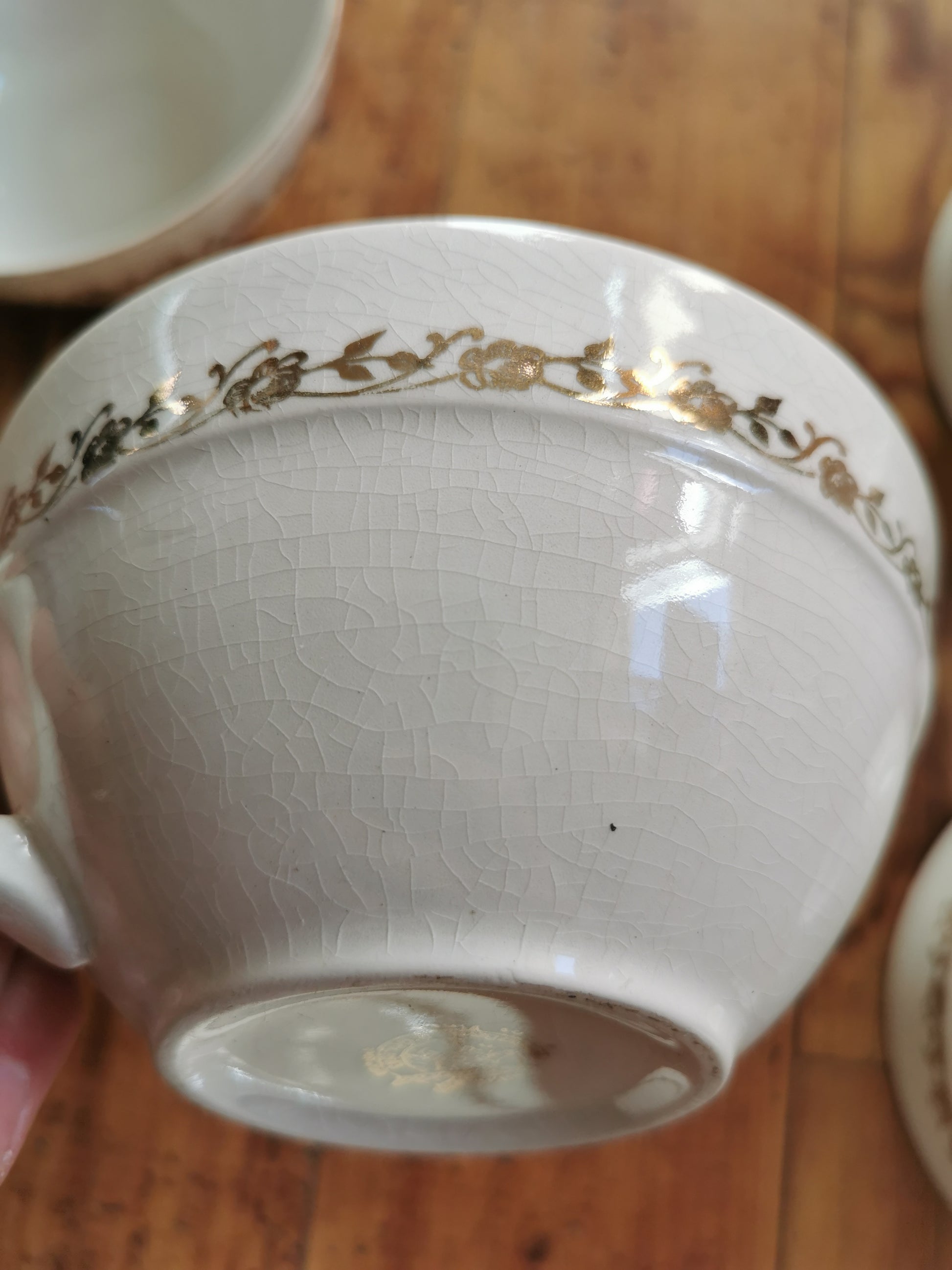 Lot de 6 grandes tasses vintage en faïence Moulin des Loups Orchies. Blanches et dorées.